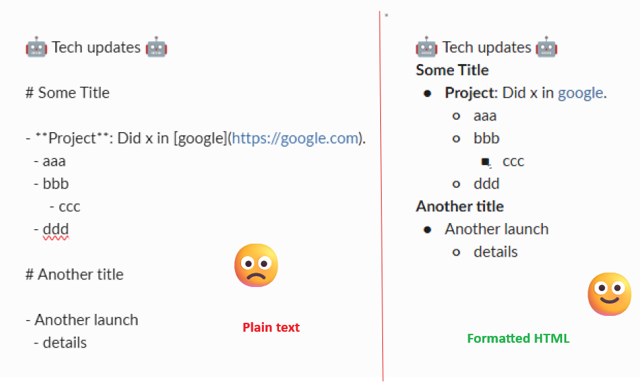 | xclip -sel clipboard -t text/html -alt-text "Updates"Note: The Python step is only needed if you want to fix Slack’s broken handling of nested lists. For simple formatting (bold, links, headings), Pandoc -> xclip alone is enough.